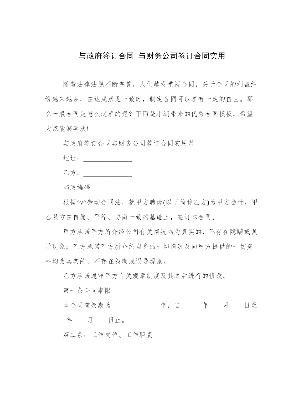 与政府签订合同与财务公司签订合同实用随着法律法规不断完善,人们越发重视合同,关于合同的利益纠纷越来越多,在达成意见一致时,制定合同可以享有一定的自由。那么一般合同是怎么起草的呢?下面是小编带来的优秀合同模板,希望大家能够喜欢!与政府签订合同与财务公司签订合同实用篇一地址:______________乙方:______________邮政编码______________根据^v^劳动合同法,就甲方聘请(以下简称乙方)为甲方会计,甲乙双方在自愿、平等、协商一致的基础上,签订本合同。甲方承诺甲方所介绍公司有关情