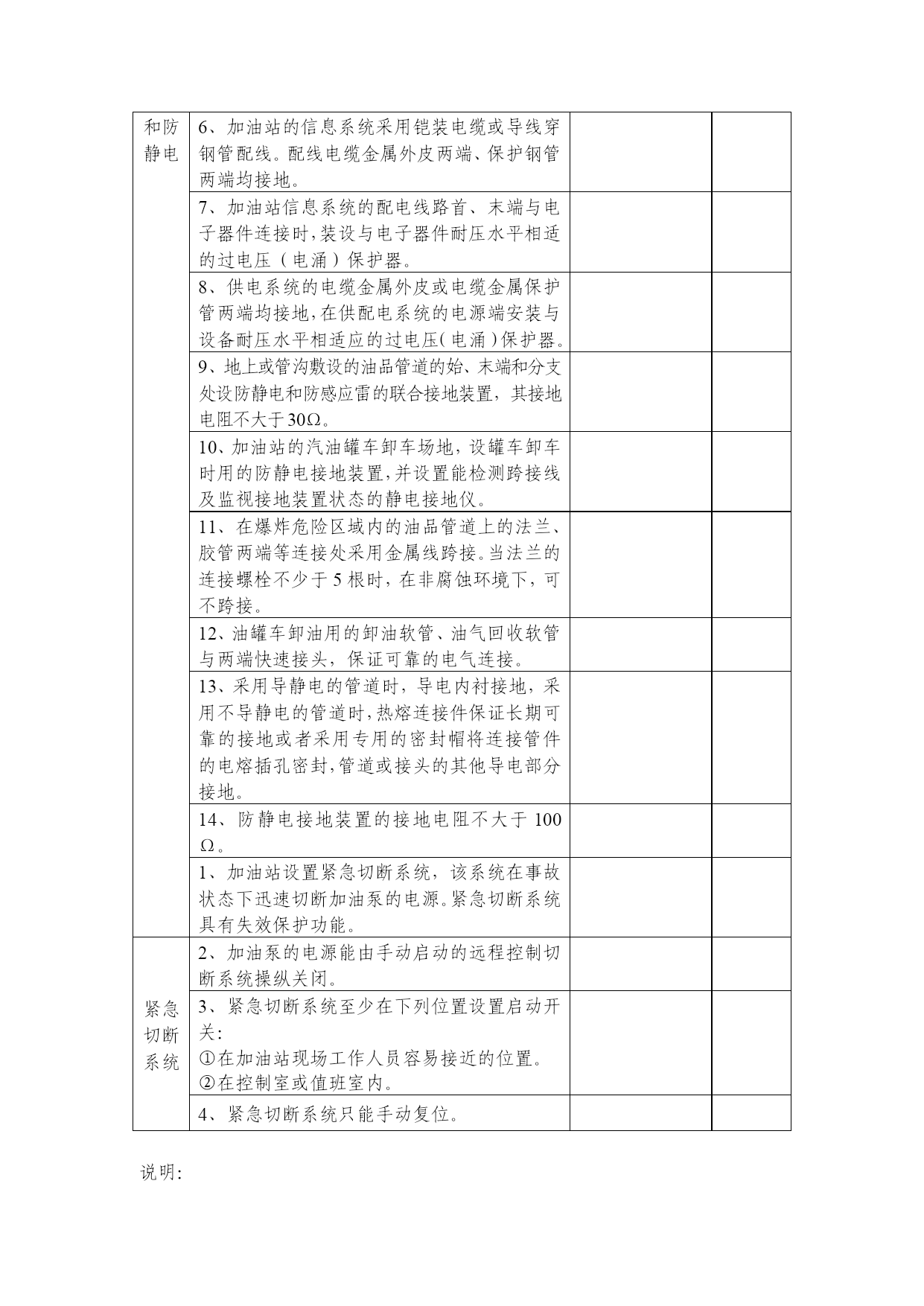 最新加油站安全检查表一、全然条件工程检查内容检查记录结论1、有工商行政管理部分核发的营业执照或企业名称预先同意通知书。2、有经营跟储存场所建筑物消防安全验收文件或其他消防方面的证件。3、有经营储存场所、配备产权或租赁证明文证明件。租赁储存场所、配备且委托出租方停顿管文件理的有与出租方签订的安全管理协议。4、有省级商业部分宣布的成品油零售经营批准证书或赞同文件。5、证明文件的名称、地点不合符合《危险化学品经营容许证宣布管理实施细那么》〔安监发[2014]18号〕的有关恳求。二、安全管理工程检查内容1、要紧担