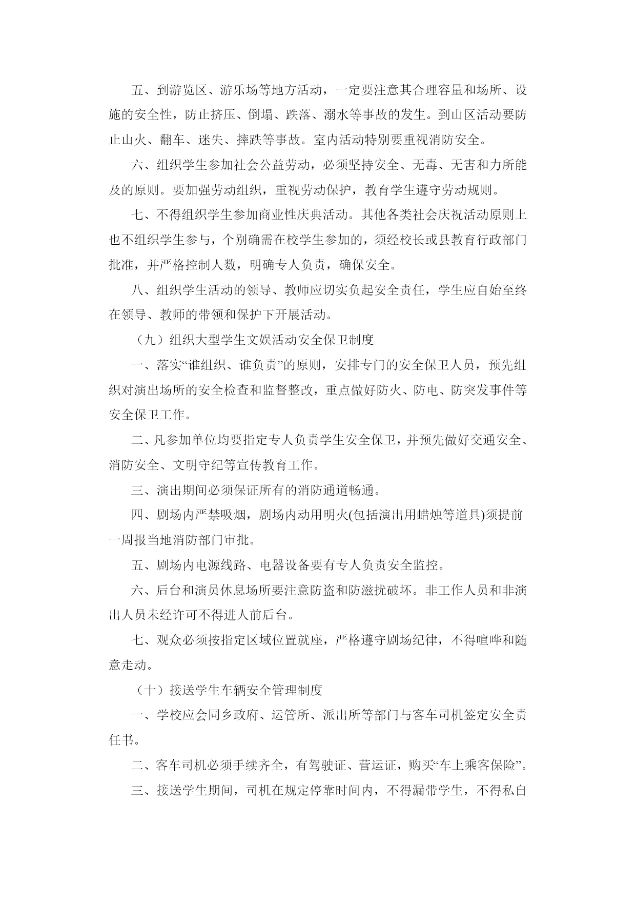 学校各项安全管理制度作者:佚名文章来源:HYPERLINK"http://www.ycy.com.cn/ShowCopyFrom.asp?ChannelID=1&SourceName=%D7%AA%D4%D8"转载更新时间:2007-6-238:58:57(一)安全领导小组定期会议制度一、为研究讨论和解决安全工作中出现的问题,学校安全领导小组原则上每月召开一次会议;二、学习贯彻上级有关安全工作的方针、政策、规定、指示;三、负责安全的部门或同志应做好学校各部门的协调工作;四、对于突发事件,分管领导要及