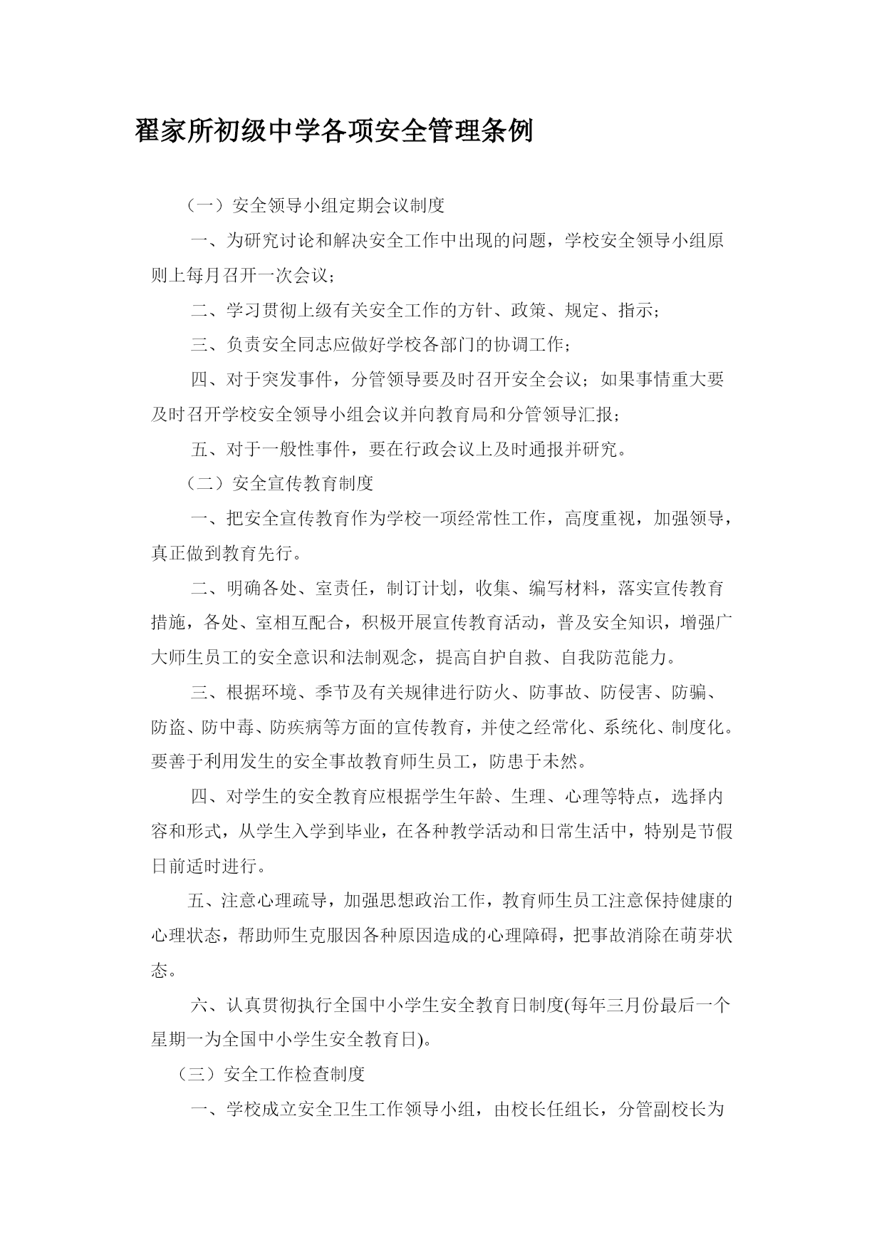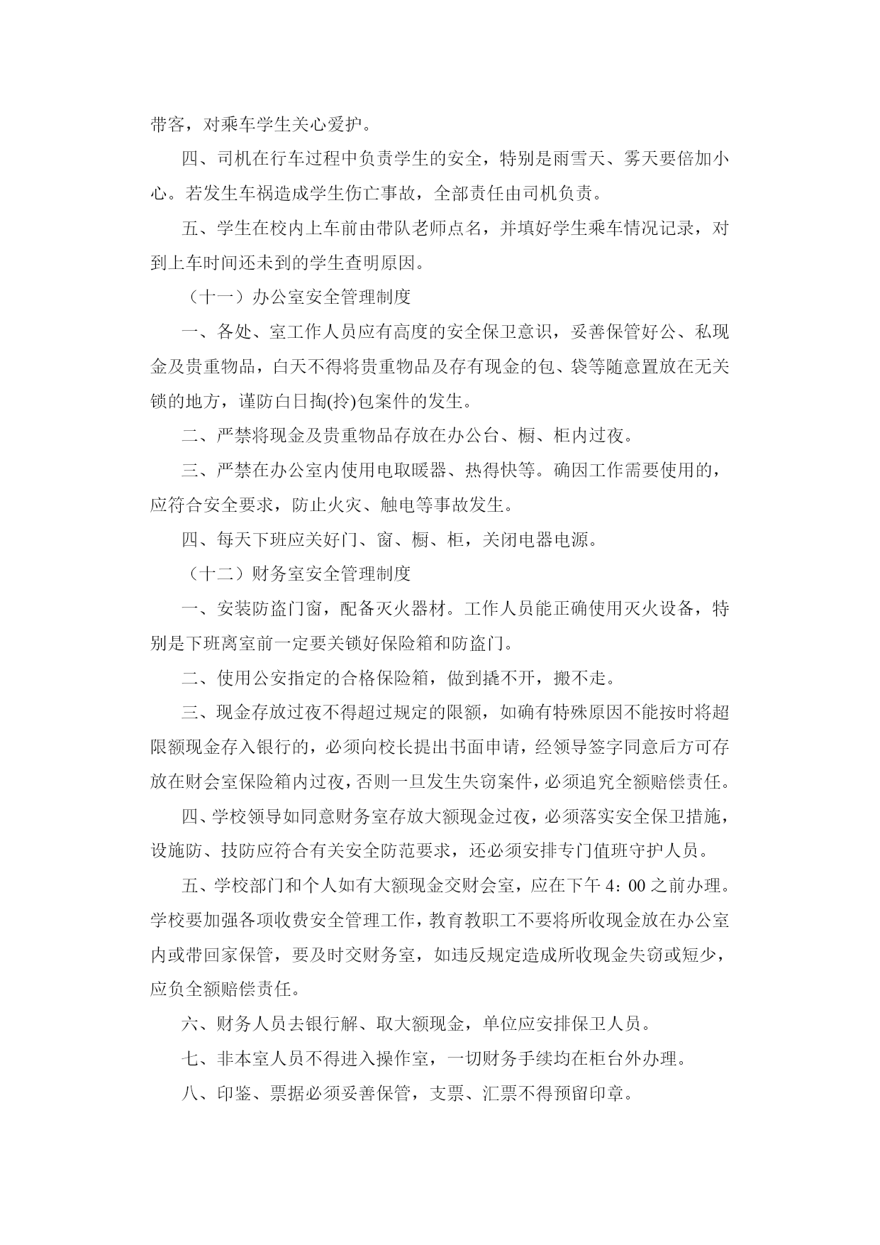 学校各项安全管理制度学校各项安全管理制度一)安全领导小组定期会议制度一、为研究讨论和解决安全工作中出现的问题,学校安全领导小组原则上每月召开一次会议;二、学习贯彻上级有关安全工作的方针、政策、规定、指示;三、负责安全的部门或同志应做好学校各部门的协调工作; 四、对于突发事件,分管领导要及时召开安全会议;如果事情重大要及时召开学校安全领导小组会议并向教育局和分管领导汇报; 五、对于一般性事件,要在行政会议上及时通报并研究。(二)安全宣传教育制度一、把安全宣传教育作为学校一项经常性工作,高