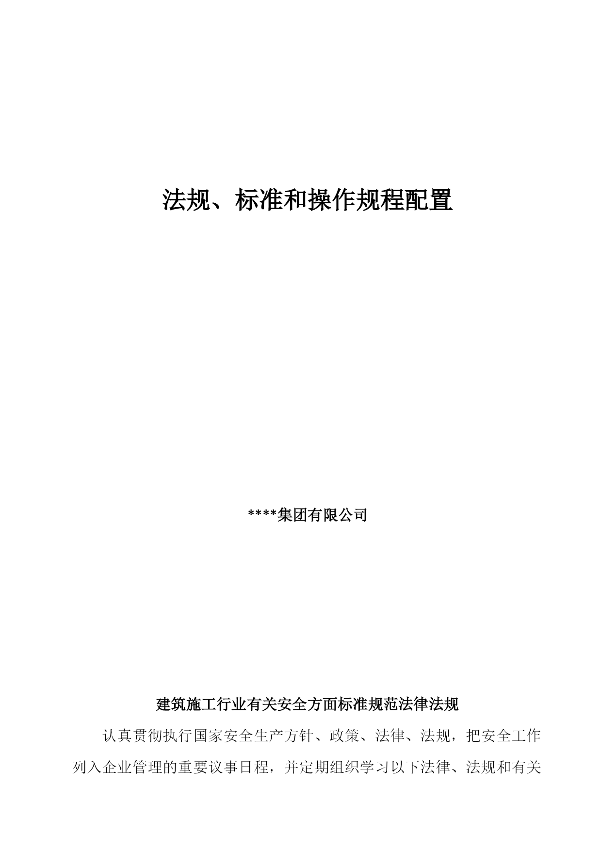 法规、标准和操作规程配置****集团有限公司建筑施工行业有关安全方面标准规范法律法规认真贯彻执行国家安全生产方针、政策、法律、法规把安全工作列入企业管理的重要议事日程并定期组织学习以下法律、法规和有关的政策:1、中华人民共和国安全生产法2、中华人民共和国道路交通安全法3、中华人民共和国环境保护法4、中华人民共和国建筑法5、中华人民共和国劳动合同法6、中华人民共和国食品安全法7、中华人民共和国未成年人保护法8、中华人民共和国消防法9、中华人民共和国职业病防治法10、重大事故隐患