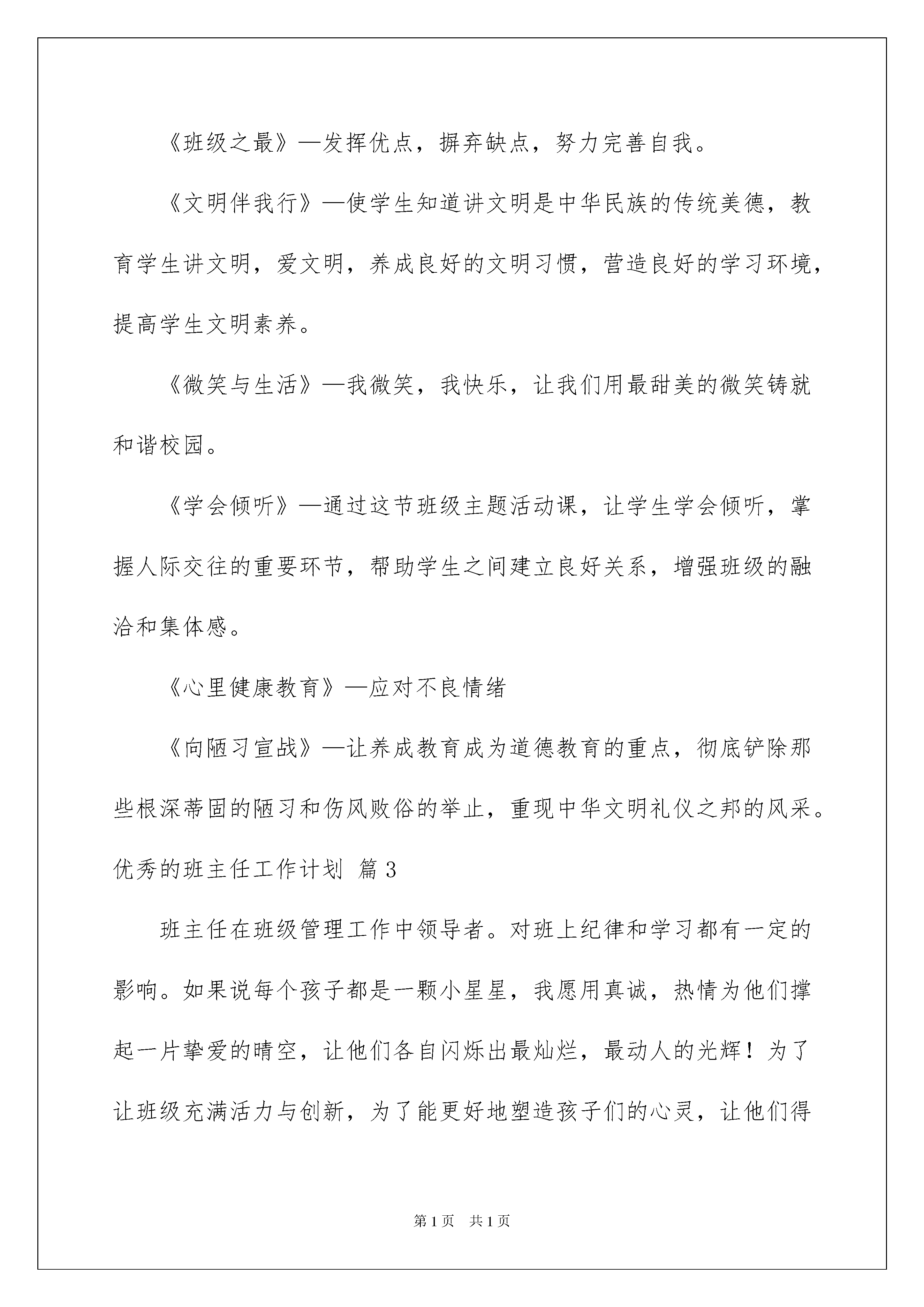 此资料由网络收集而来,如有侵权请告知上传者立即删除。资料共分享,我们负责传递知识。优秀班主任工作计划高中篇一今年我担任高一级(4)班的班主任。高一对于学生来说是个关键的学年,这关系到他们的初高中的衔接问题,肩上的责任重大。思考良久,根据高一学生的实际特点和我们学校的实际情况以及自身的条件,我制定出高中班主任工作计划:一、指导思想我准备本着以下四个原则来执行我的一切计划和任务:尊重;信任;平等;关注在德育工作计划中,班主任要尊重并相信学生的力量,要相信学生都有积极的一面。如果班