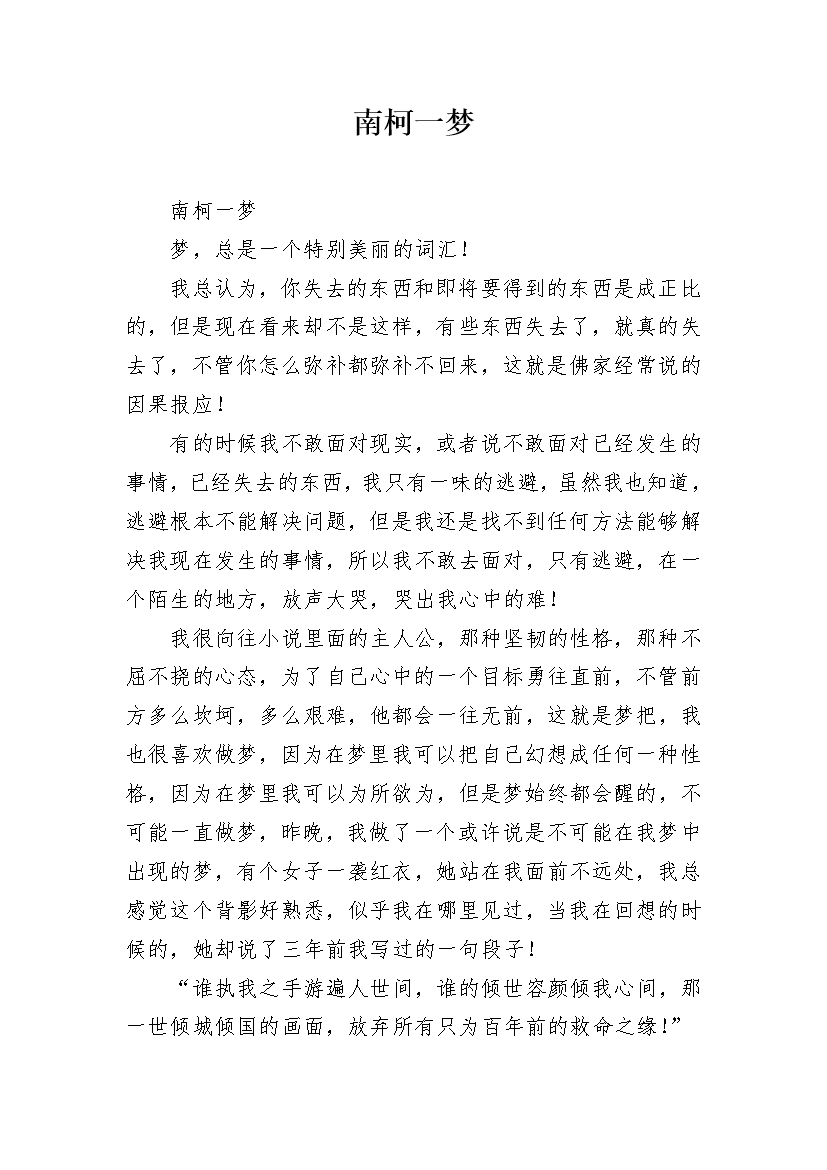 南柯一梦南柯一梦梦,总是一个特别美丽的词汇!我总认为,你失去的东西和即将要得到的东西是成正比的,但是现在看来却不是这样,有些东西失去了,就真的失去了,不管你怎么弥补都弥补不回来,这就是佛家经常说的因果报应!有的时候我不敢面对现实,或者说不敢面对已经发生的事情,已经失去的东西,我只有一味的逃避,虽然我也知道,逃避根本不能解决问题,但是我还是找不到任何方法能够解决我现在发生的事情,所以我不敢去面对,只有逃避,在一个陌生的地方,放声大哭,哭出我心中的难!我很向往小说里面的主人公,那种坚韧的性格,那种不屈不挠的心