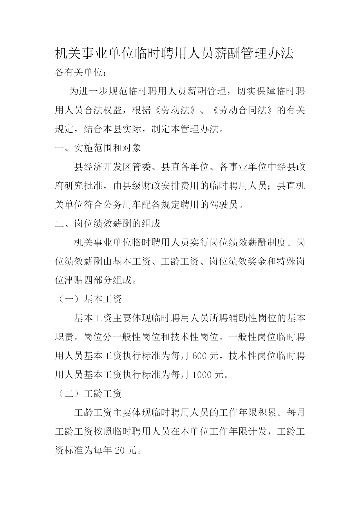 机关事业单位临时聘用人员薪酬管理办法各有关单位:为进一步规范临时聘用人员薪酬管理,切实保障临时聘用人员合法权益,根据《劳动法》、《劳动合同法》的有关规定,结合本县实际,制定本管理办法。一、实施范围和对象县经济开发区管委、县直各单位、各事业单位中经县政府研究批准,由县级财政安排费用的临时聘用人员;县直机关单位符合公务用车配备规定聘用的驾驶员。二、岗位绩效薪酬的组成机关事业单位临时聘用人员实行岗位绩效薪酬制度。岗位绩效薪酬由基本工资、工龄工资、岗位绩效奖金和特殊岗位津贴四部分组成。(一)基本工资基本工资主要体