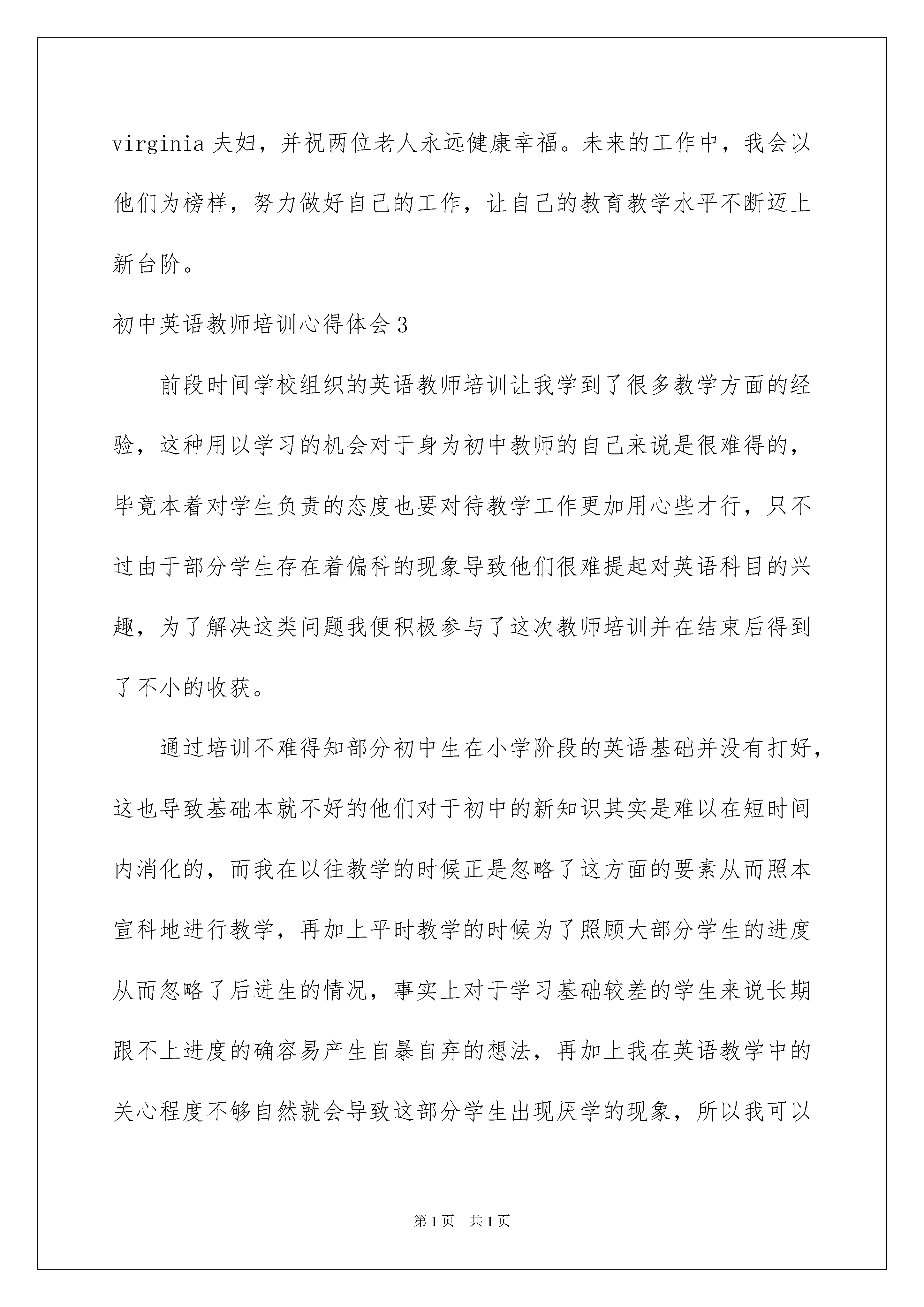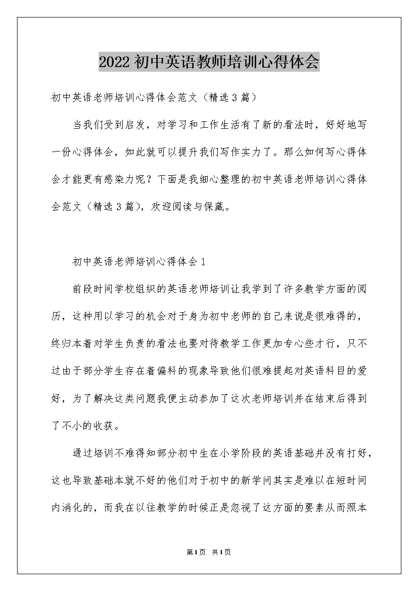 2022初中英语教师培训心得体会初中英语老师培训心得体会范文(精选3篇)当我们受到启发,对学习和工作生活有了新的看法时,好好地写一份心得体会,如此就可以提升我们写作实力了。那么如何写心得体会才能更有感染力呢?下面是我细心整理的初中英语老师培训心得体会范文(精选3篇),欢迎阅读与保藏。初中英语老师培训心得体会1前段时间学校组织的英语老师培训让我学到了许多教学方面的阅历,这种用以
