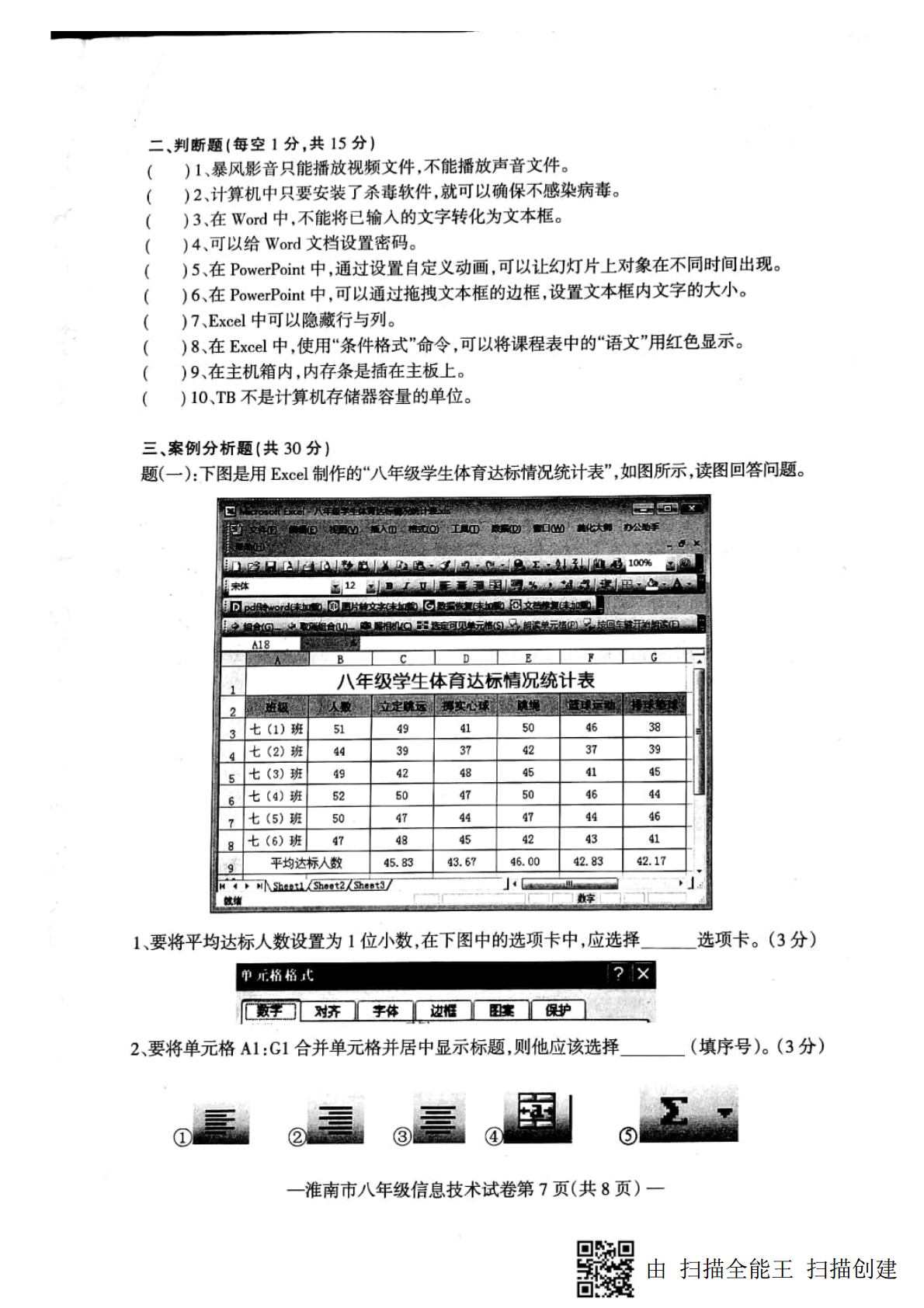 1安徽省淮南市2017-2018学年八年级信息技术下学期期末试题一、选择题:(请把答案填在下列表格中1—25题,每题2分,共50分)题号12345678910111213答案DAABCCABABACA题号141516171819202122232425答案AACDCDBDABBA二、判断题(每空2分,共20分)题号12345678910答案╳╳╳√√╳√√√╳三、案例分析(每题15分,共30分)题(一):1、数字2、eq\o\ac(○,4)3、=AVERAGE(C3