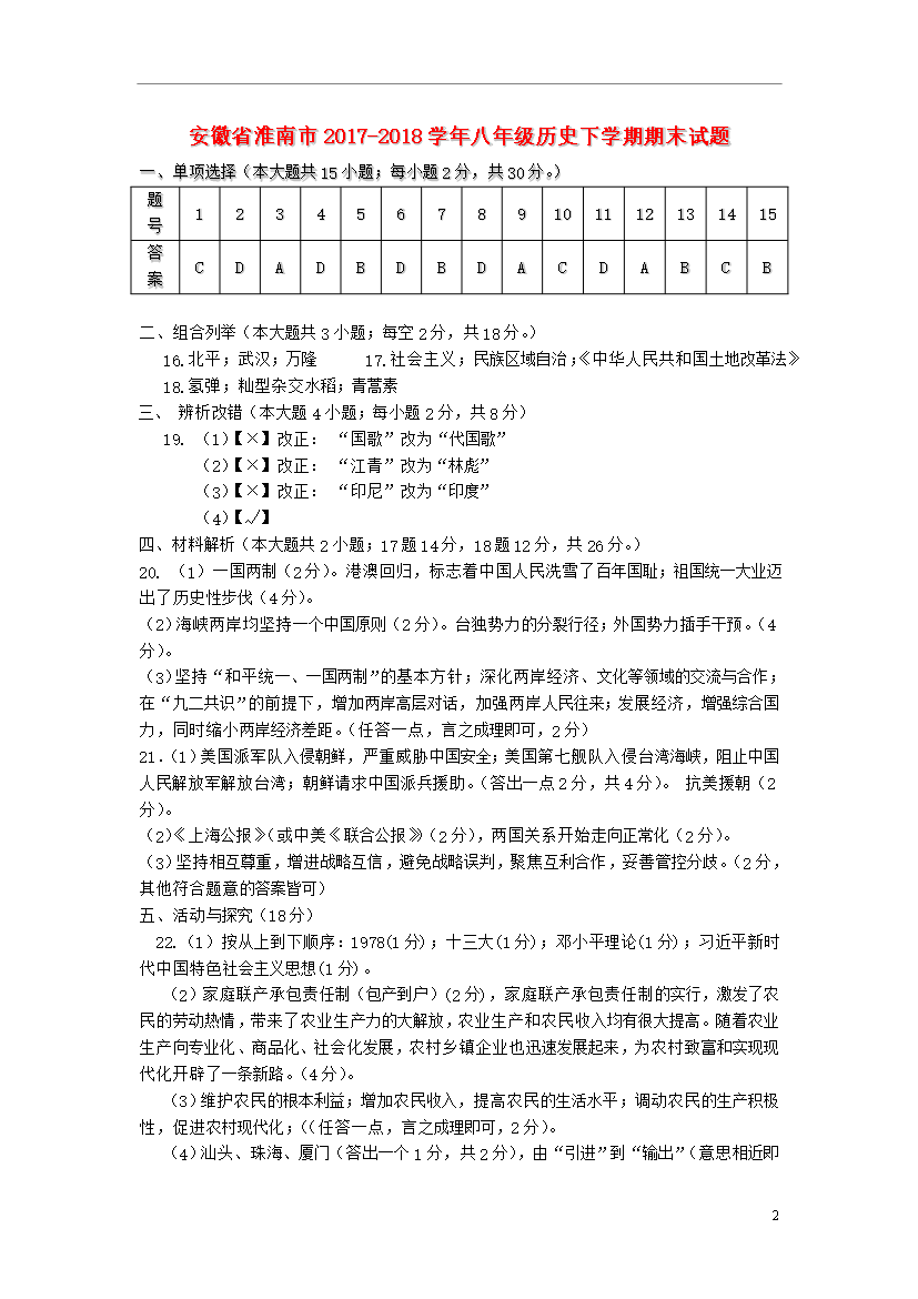2安徽省淮南市2017-2018学年八年级历史下学期期末试题一、单项选择(本大题共15小题;每小题2分,共30分。)题号123456789101112131415答案CDADBDBDACDABCB二、组合列举(本大题共3小题;每空2分,共18分。)16.北平;武汉;万隆17.社会主义;民族区域自治;《中华人民共和国土地改革法》18.氢弹;籼型杂交水稻;青蒿素三、辨析改错(本大题4小题;每小题2分,共8分)19.(1)【×】改正:“国歌”改为“代国歌”(2)【×】改正:“江青”改为“林彪”(3)【×】改正: