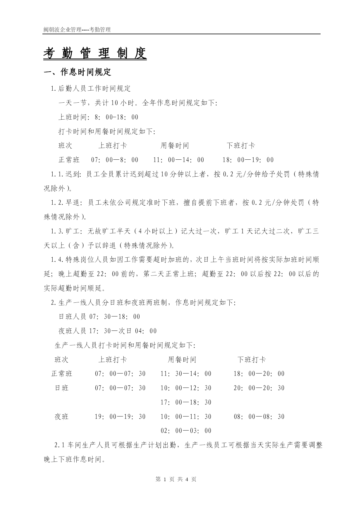 阙朝波企业管理----考勤管理第页共NUMPAGES4页考勤管理制度一、作息时间规定1.后勤人员工作时间规定一天一节,共计10小时。全年作息时间规定如下:上班时间:8:00-18:00打卡时间和用餐时间规定如下:班次上班打卡用餐时间下班打卡正常班07:00—8:0011:00—14:0018:00—19:001.1.迟到:员工全员累计迟到超过10分钟以上者,按0.2元/分钟给予处罚(特殊情况除外)。1.2.早退:员工未依公司规定准时下班,擅自提前下班者,按0.2元/分钟