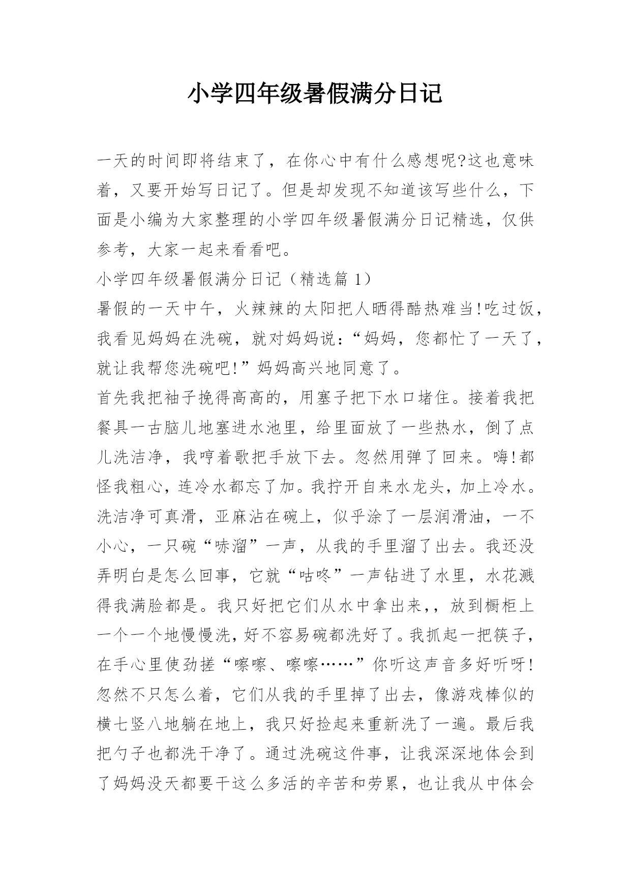 小学四年级暑假满分日记一天的时间即将结束了,在你心中有什么感想呢?这也意味着,又要开始写日记了。但是却发现不知道该写些什么,下面是小编为大家整理的小学四年级暑假满分日记精选,仅供参考,大家一起来看看吧。小学四年级暑假满分日记(精选篇1)暑假的一天中午,火辣辣的太阳把人晒得酷热难当!吃过饭,我看见妈妈在洗碗,就对妈妈说:“妈妈,您都忙了一天了,就让我帮您洗碗吧!”妈妈高兴地同意了。首先我把袖子挽得高高的,用塞子把下水口堵住。接着我把餐具一古脑儿地塞进水池里,给里面放了一些热水,倒了点儿洗洁净,我哼着歌把手放