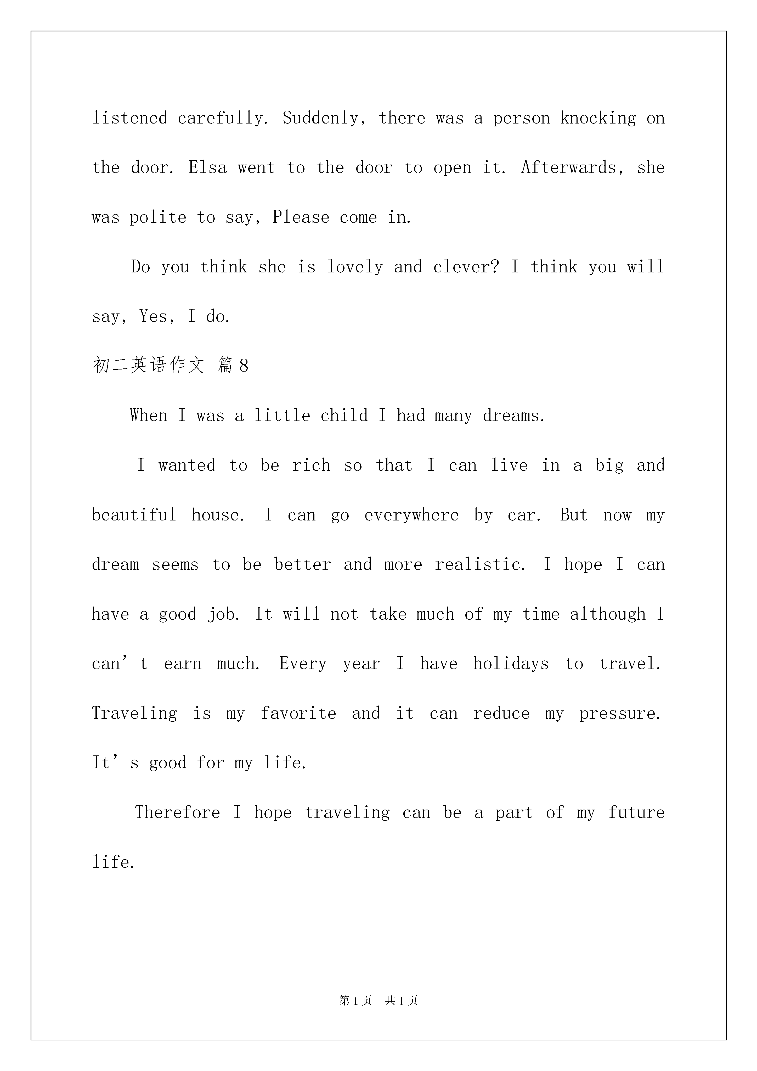 2022初二英语作文集合8篇初二英语作文集合8篇在平日的学习、工作和生活里大家都经常看到作文的身影吧作文可分为小学作文、中学作文、大学作文(论文)。你知道作文怎样才能写的.好吗?以下是我收集整理的初二英语作文8篇欢迎大家借鉴与参考希望对大家有所帮助。初二英语作文篇1
