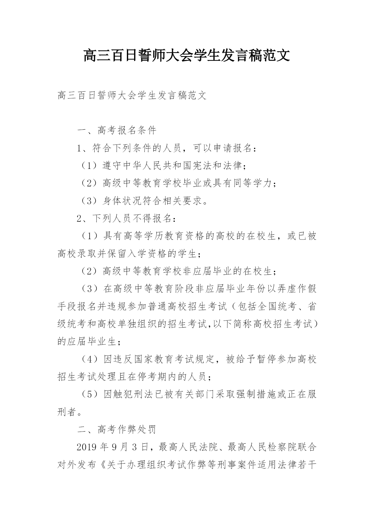 高三百日誓师大会学生发言稿范文高三百日誓师大会学生发言稿范文一、高考报名条件1、符合下列条件的人员,可以申请报名:(1)遵守中华人民共和国宪法和法律;(2)高级中等教育学校毕业或具有同等学力;(3)身体状况符合相关要求。2、下列人员不得报名:(1)具有高等学历教育资格的高校的在校生,或已被高校录取并保留入学资格的学生;(2)高级中等教育学校非应届毕业的在校生;(3)在高级中等教育阶段非应届毕业年份以弄虚作假手段报名并违规参加普通高校招生考试(包括全国统考、省级统考和高校单独组织的招生考试,以下简称高校招生