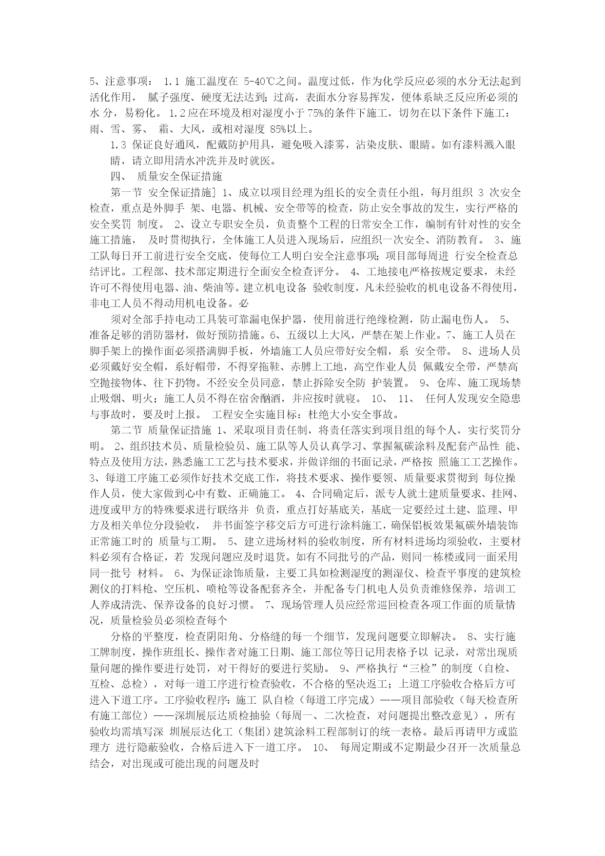 本文由xiongyunfank贡献doc文档可能在WAP端浏览体验不佳。建议您优先选择TXT,或下载源文件到本机查看。氟碳金属漆施工方案一、主要施工工具常用的电动搅拌机、搅拌桶、小型油柒桶、橡胶塑料刮板、橡皮滚筒、铁皮小刮板、扫帚、墩布、喷灯、磅称、小抹子、铲刀、靠尺、空气压缩机、W71喷枪、电动吊篮等。二、施工作业条件1、外墙抹灰达到“高级抹灰要求”。2、基层含水率小于10%,基层表面平整干净,不得有浮灰、砂粒残渣。3、对幕墙,窗进行覆盖保护。三、氟碳仿金属铝板施工工艺1、适用范围:、适用范围:本工艺适