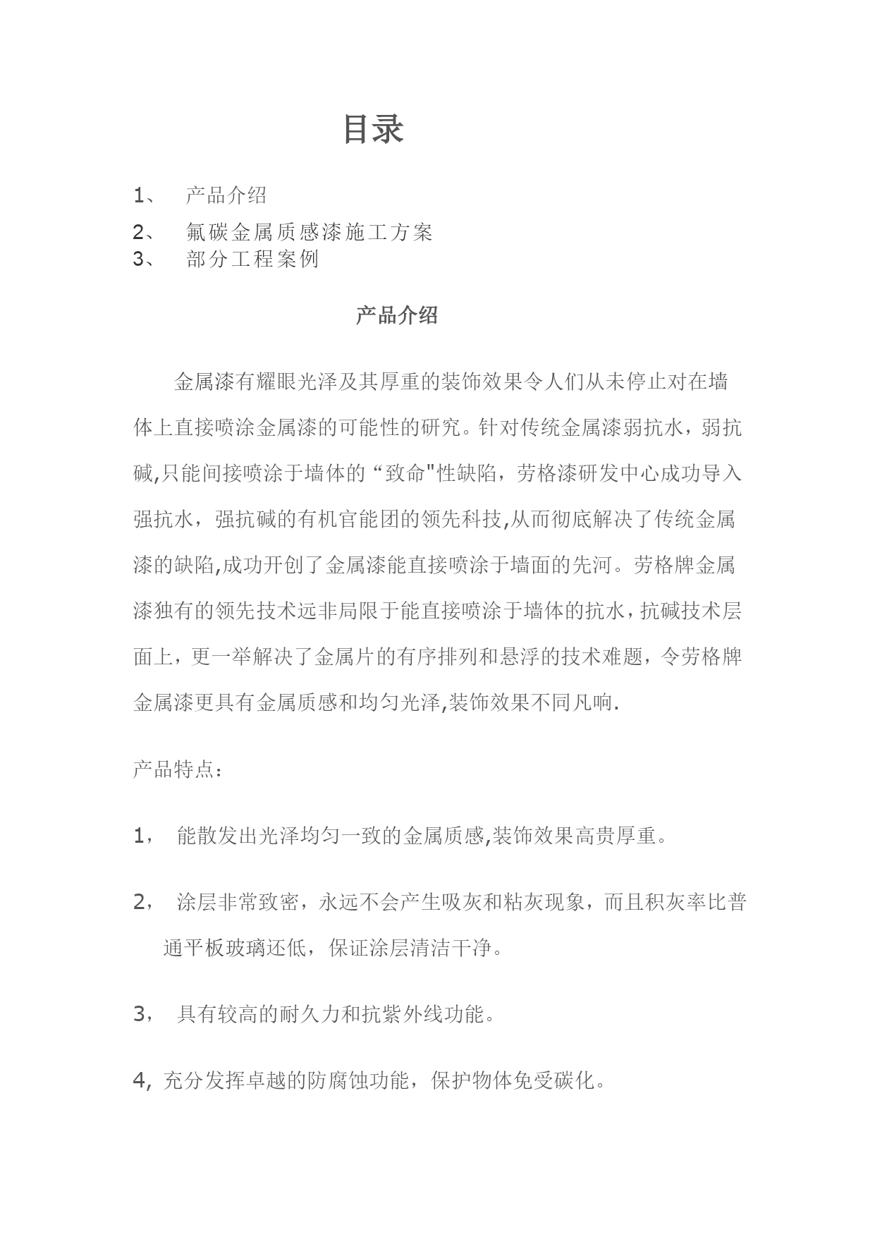 目录产品介绍氟碳金属质感漆施工方案部分工程案例产品介绍HYPERLINK”http://www。bmlink.com/supply/jinshuqi”\o"金属漆"\t”_blank”金属漆有耀眼光泽及其厚重的装饰效果令人们从未停止对在HYPERLINK"http://www。bmlink。com/supply/qiangti"\o"墙体"\t"_blank"墙体上直接喷涂金属漆的可能性的研究。针对传统金属漆弱抗水,弱抗碱,只能间接喷涂于墙体的“致命”性缺陷,劳格漆研发中心成功导入强抗水,强抗