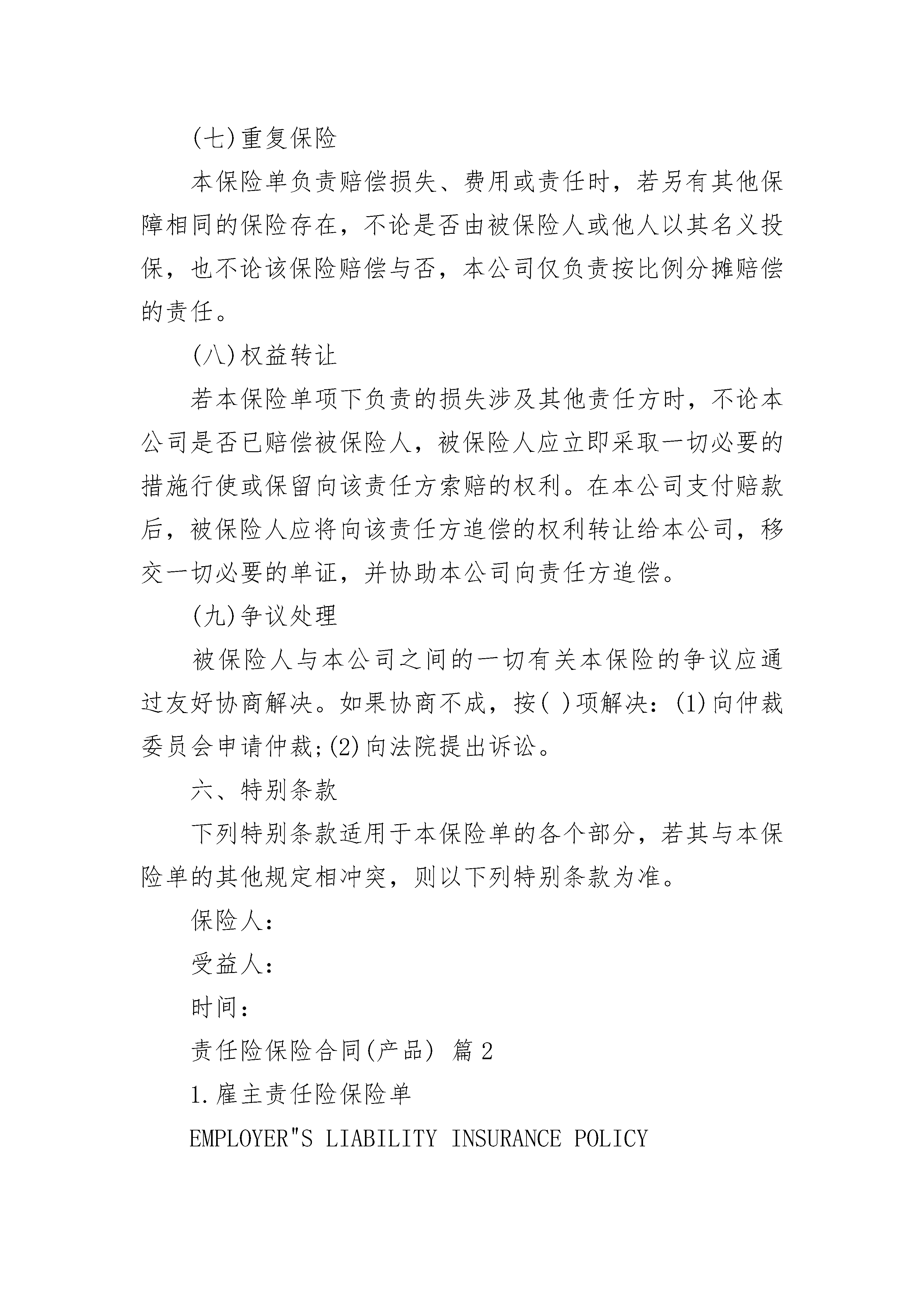 责任险保险合同(产品)责任险保险合同(产品)(精选17篇)责任险保险合同(产品)篇1一、责任范围在本保险有效期内,由于被保险人所生产、出售的产品或商品在承保区域内发生事故,造成使用、消费或操作该产品或商品的人或其他任何人的人身伤害、疾病、死亡或财产损失,依法应由被保险人负责时,本公司根据本保险单的规定,在约定的赔偿限额内负责赔偿。对被保险人应付索赔人的诉讼费用以及经本公司书面同意负责的诉讼及其他费用,本公司亦负责赔偿,但本项费用与责任赔偿金额之和以本保险单明细表中列明的责任限额为限。二、除外责任本公司