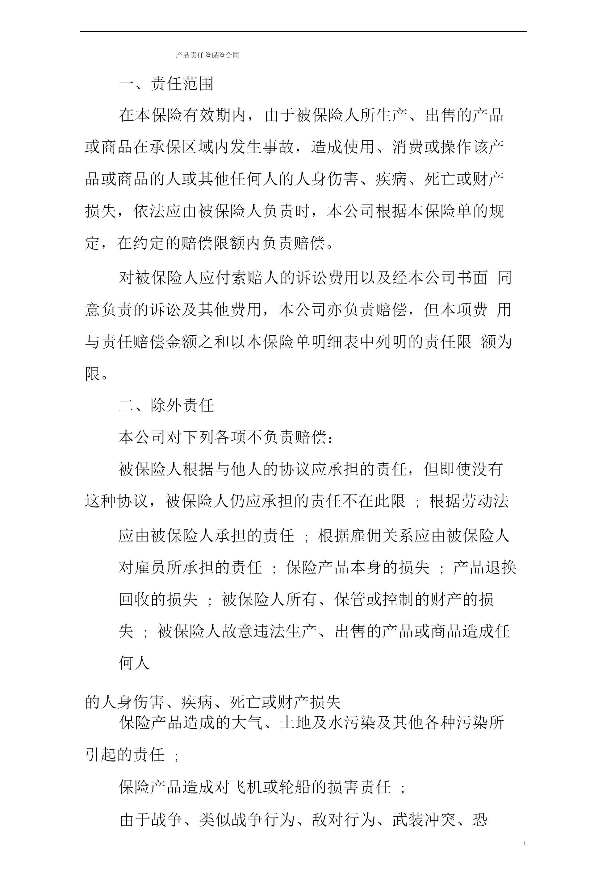 产品责任险保险合同一、责任范围在本保险有效期内,由于被保险人所生产、出售的产品或商品在承保区域内发生事故,造成使用、消费或操作该产品或商品的人或其他任何人的人身伤害、疾病、死亡或财产损失,依法应由被保险人负责时,本公司根据本保险单的规定,在约定的赔偿限额内负责赔偿。对被保险人应付索赔人的诉讼费用以及经本公司书面同意负责的诉讼及其他费用,本公司亦负责赔偿,但本项费用与责任赔偿金额之和以本保险单明细表中列明的责任限额为限。二、除外责任本公司对下列各项不负责赔偿:被保险人根据与他人的协议应承担的责任,但即使没有
