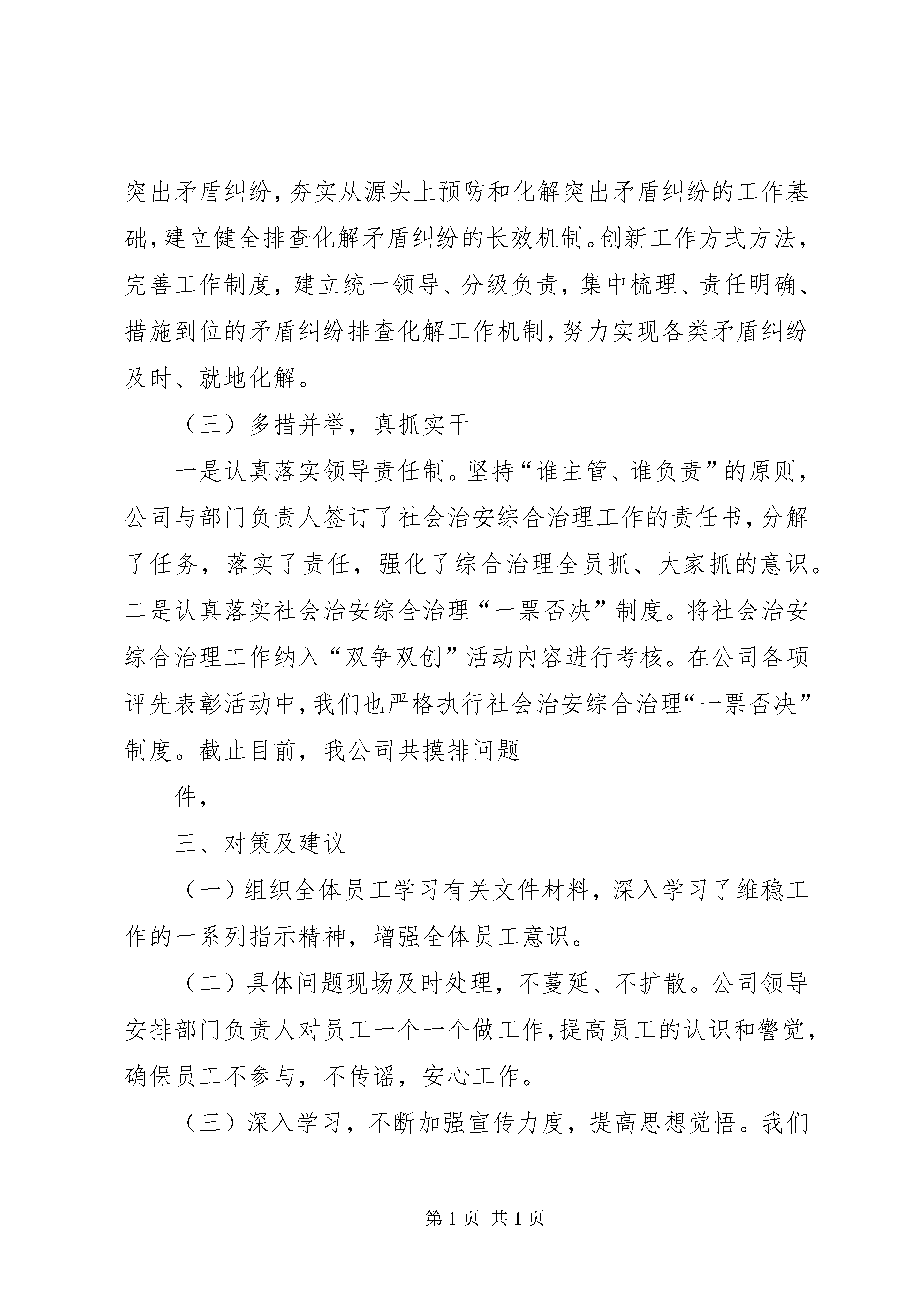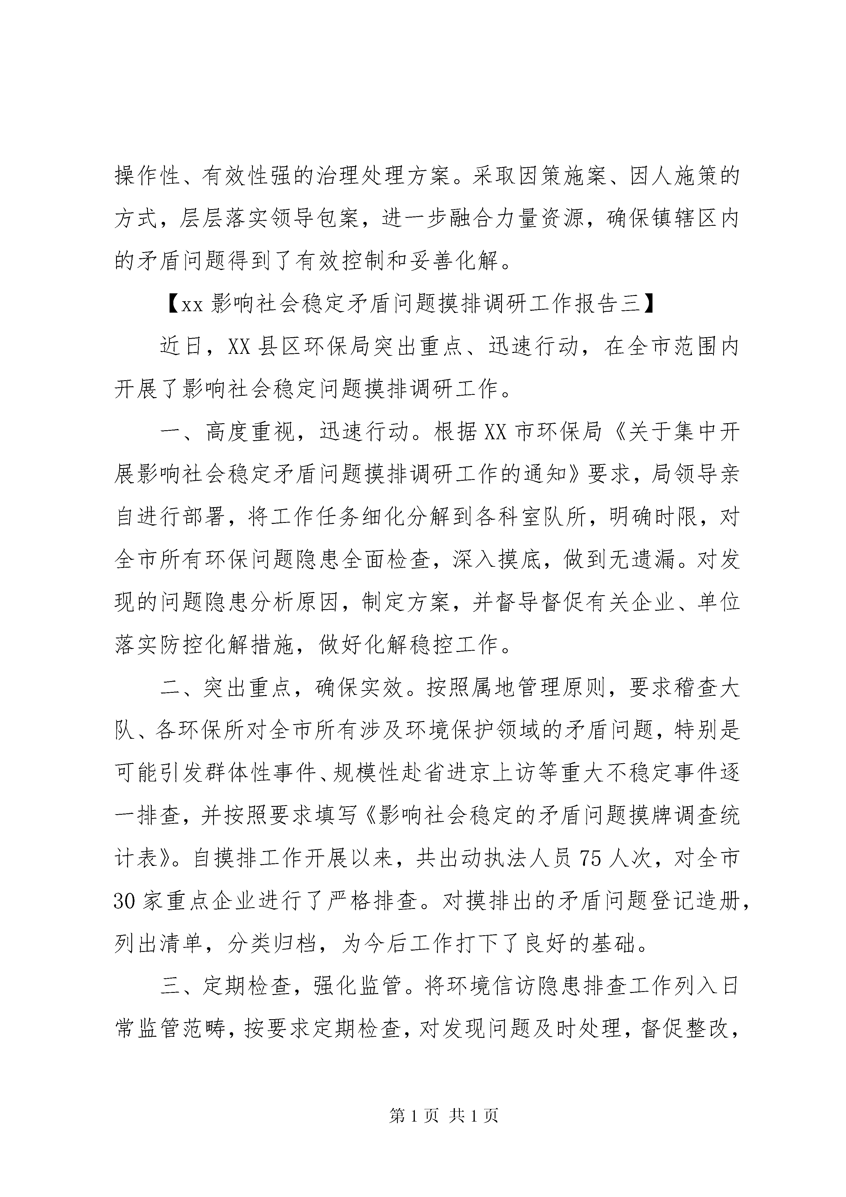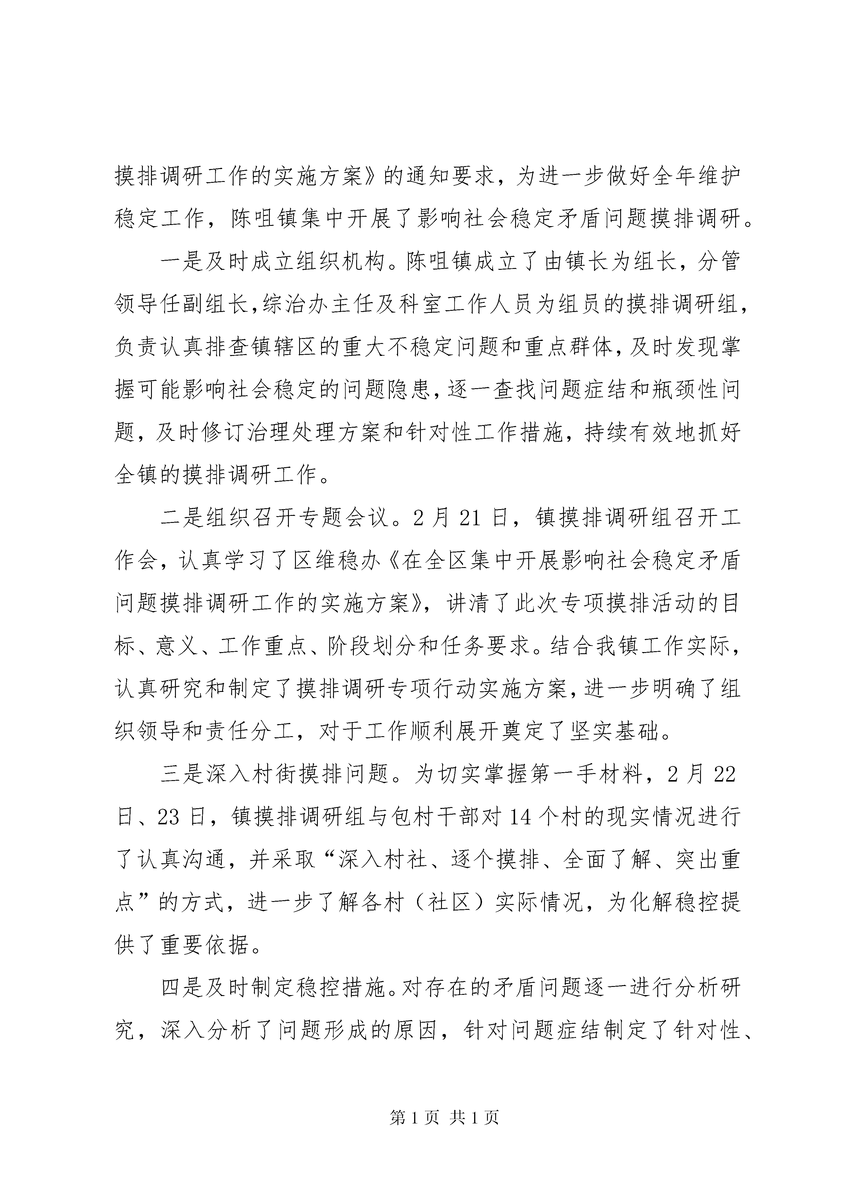第PAGE\*Arabic\*MERGEFORMAT32页共NUMPAGES\*MERGEFORMAT32页关于影响社会稳定矛盾问题全面调查摸底分析报告根据国资委、xxx维稳办的工作安排,我公司综治办按照要求内容,积极深入基层进行了解调研,现将调研情况报告如下:一、当前矛盾问题的现状及其原因分析当前,社会治安形式总体良好,但是,维护稳定的任务依然繁重。社会各方面的矛盾问题还大量存在,尤其是随着社会主义市场经济条件下各项改革的不断深入,利益格局不断调整,由此产生的矛盾问题也不断增加。较之以往,目