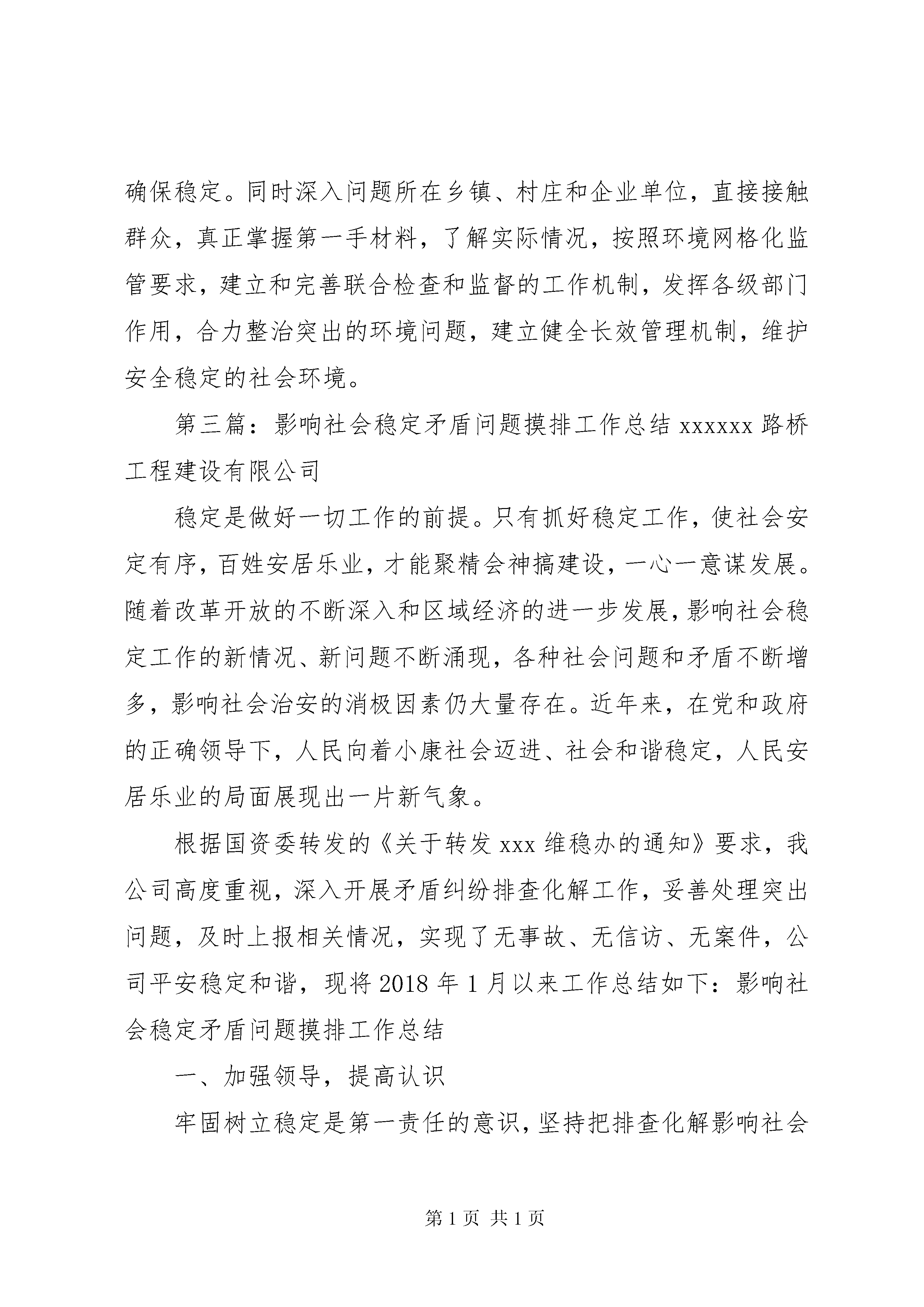 关于影响社会稳定矛盾问题全面调查摸底分析报告根据国资委、xxx维稳办的工作安排,我公司综治办按照要求内容,积极深入基层进行了解调研,现将调研情况报告如下:一、当前矛盾问题的现状及其原因分析当前,社会治安形式总体良好,但是,维护稳定的任务依然繁重。社会各方面的矛盾问题还大量存在,尤其是随着社会主义市场经济条件下各项改革的不断深入,利益格局不断调整,由此产生的矛盾问题也不断增加。较之以往,目前的矛盾问题除数量稍有上升外,在表现形式上也有很大的不同。突出表现为公民与集体经济组织、与企业