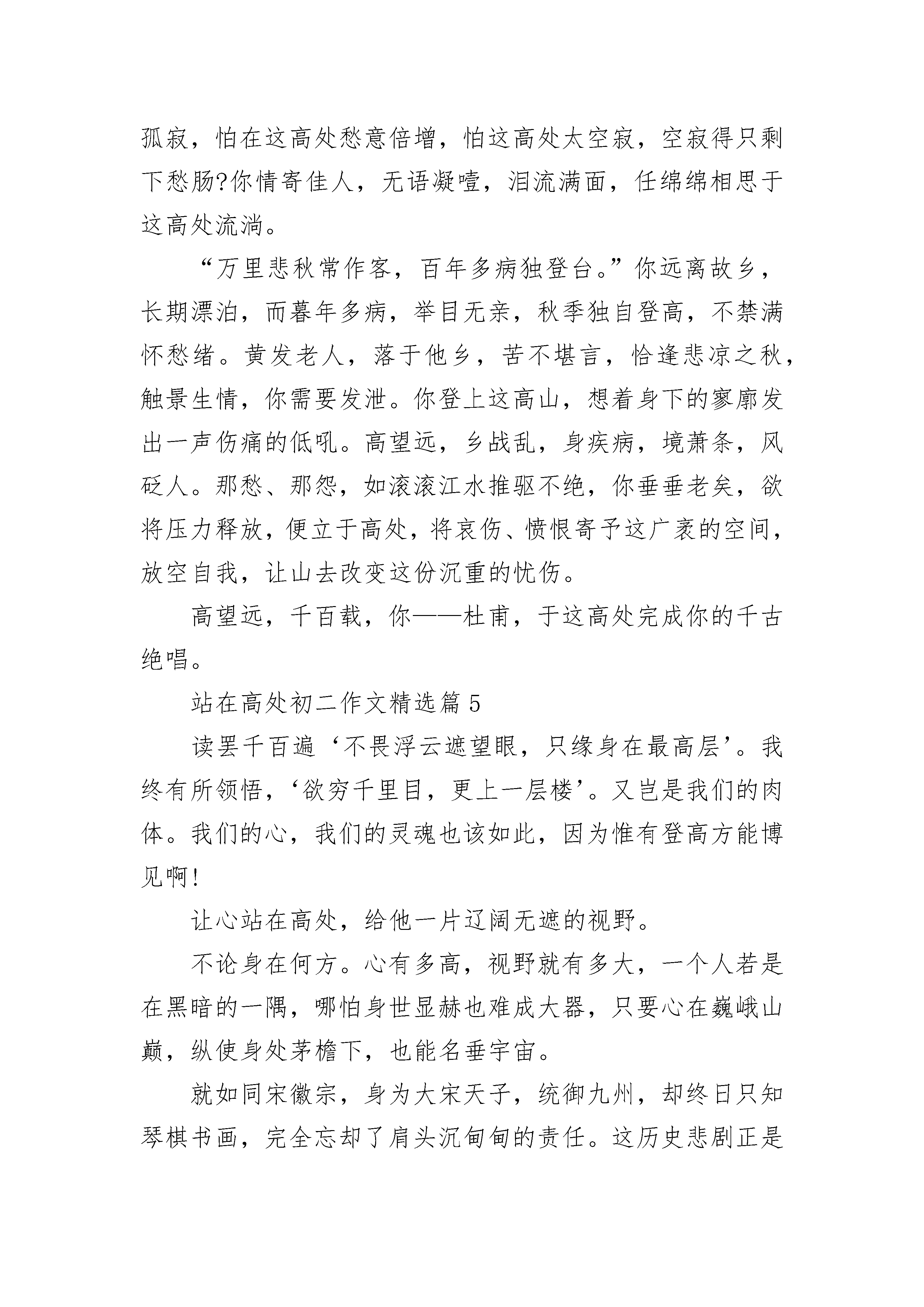 站在高处作文站在高处作文12篇在日常学习、工作抑或是生活中,大家都跟作文打过交道吧,作文是人们把记忆中所存储的有关知识、经验和思想用书面形式表达出来的记叙方式。那要怎么写好作文呢?以下是小编帮大家整理的站在高处作文,仅供参考,大家一起来看看吧。站在高处作文篇1走过生命犹如走过一条河流。河流中有许多精巧别致的卵石,这犹如生命历程中的成功。这时我们只需要弯下身,将最近的那枚石子拾起,或许这并不是你最初想要的,但只要你用心品味,它同样有价值。同样,当你还没有获得所期待的成功,不必叹息,让身体站在高处,眼睛会望得